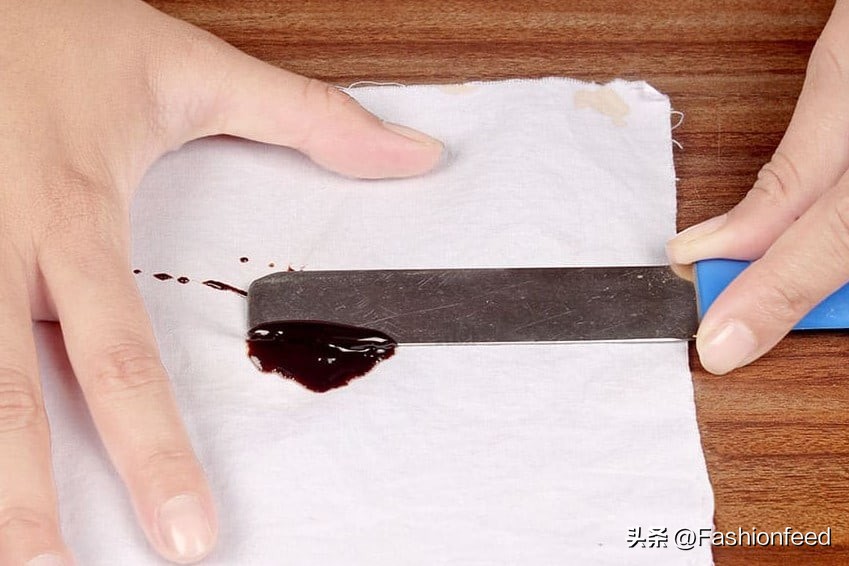 去除衣服上干涸的汁液将是一项更困难的任务。你不需要把布放在冰箱里。刚开始用黄油刀或勺子刮它。