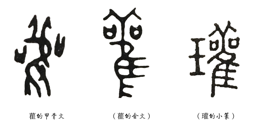 2、瓘。读作guàn。《说文解字》的解释也极简单,就是“玉也”。那么,如果我们要了解这个字,还得从它右边的字形入手,“瓘”右边是一个“雚”,“雚”在甲骨文里是一只不断发出声音的鸟(一说是猫头鹰),到了金文和小篆逐步调整字形,两个口渐渐转化成鸟的眼睛,如图: