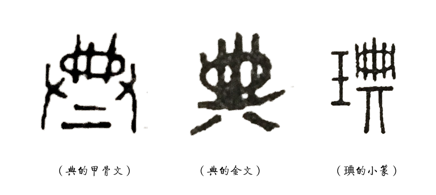 显然,“典”的意思,从甲骨文来看,就是手持册置于几案之上的形状,《说文解字》解为“接受王的册命封爵的意思,因为封爵要有个仪式,所以又有典礼的意思,由此猜想:琠,该是一种可以用于陈列于案头用于重要场合的贵重玉类吧。读作tiǎn,就是上面所说的玉名。读作tiàn时,同“瑱”,一般指古人冠冕上垂在两侧的装饰物,用玉、石、贝等制成。