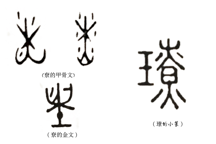1、璙。读作liáo。《说文解字》释作:“玉也。”很简单,就是有一种玉石,因为是名词,大部分字书,包括《说文》,包括《广韵》都没有更多的解释,因此我们只能从玉部右边的“尞”来入手寻找字义了,“尞”的甲骨文是以火烧木的象形,边上的小点是烟火升腾状态,到了金文才有了盛装木柴的器皿。