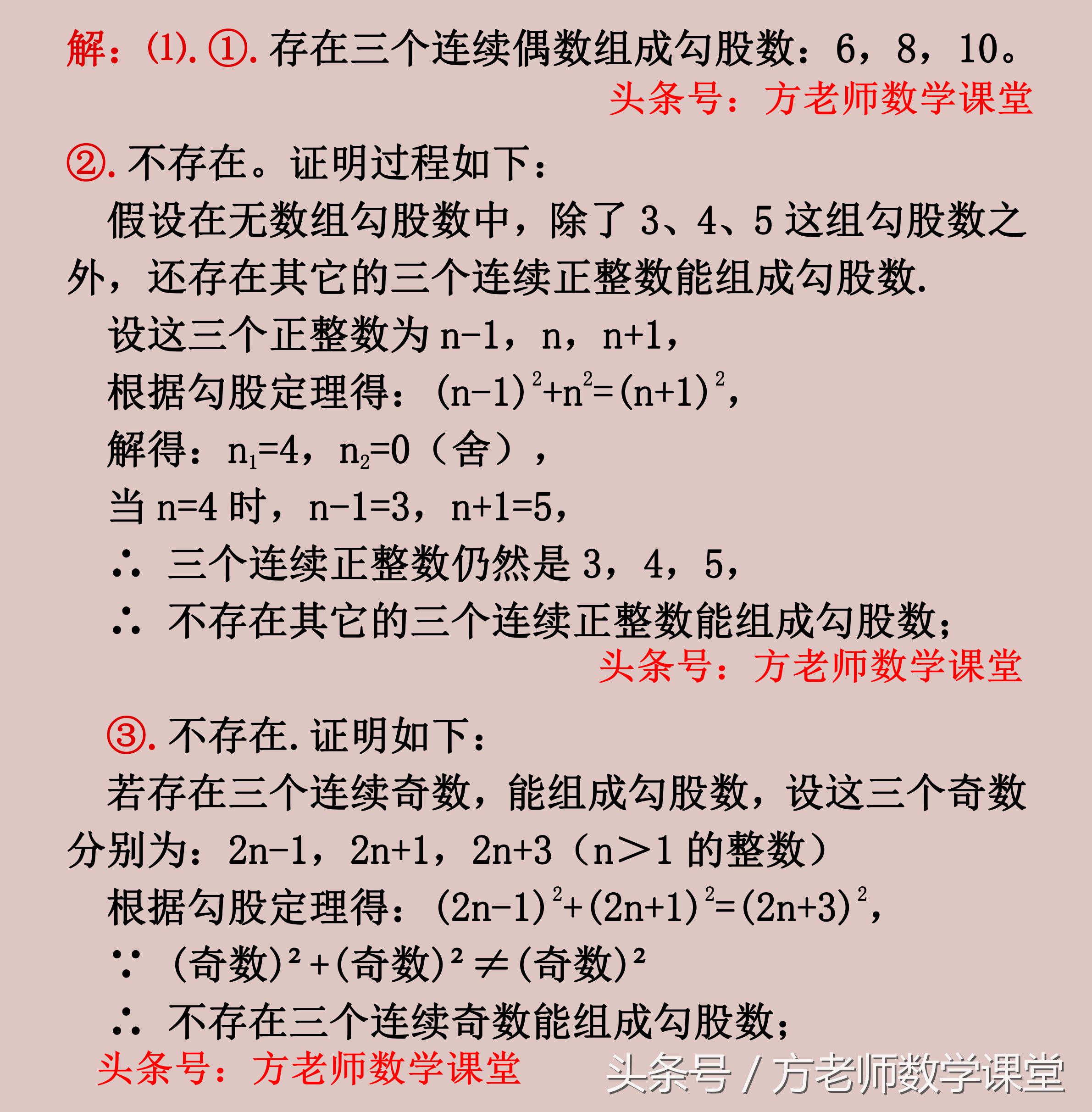 ③不存在,三个连续奇数组成的勾股数。