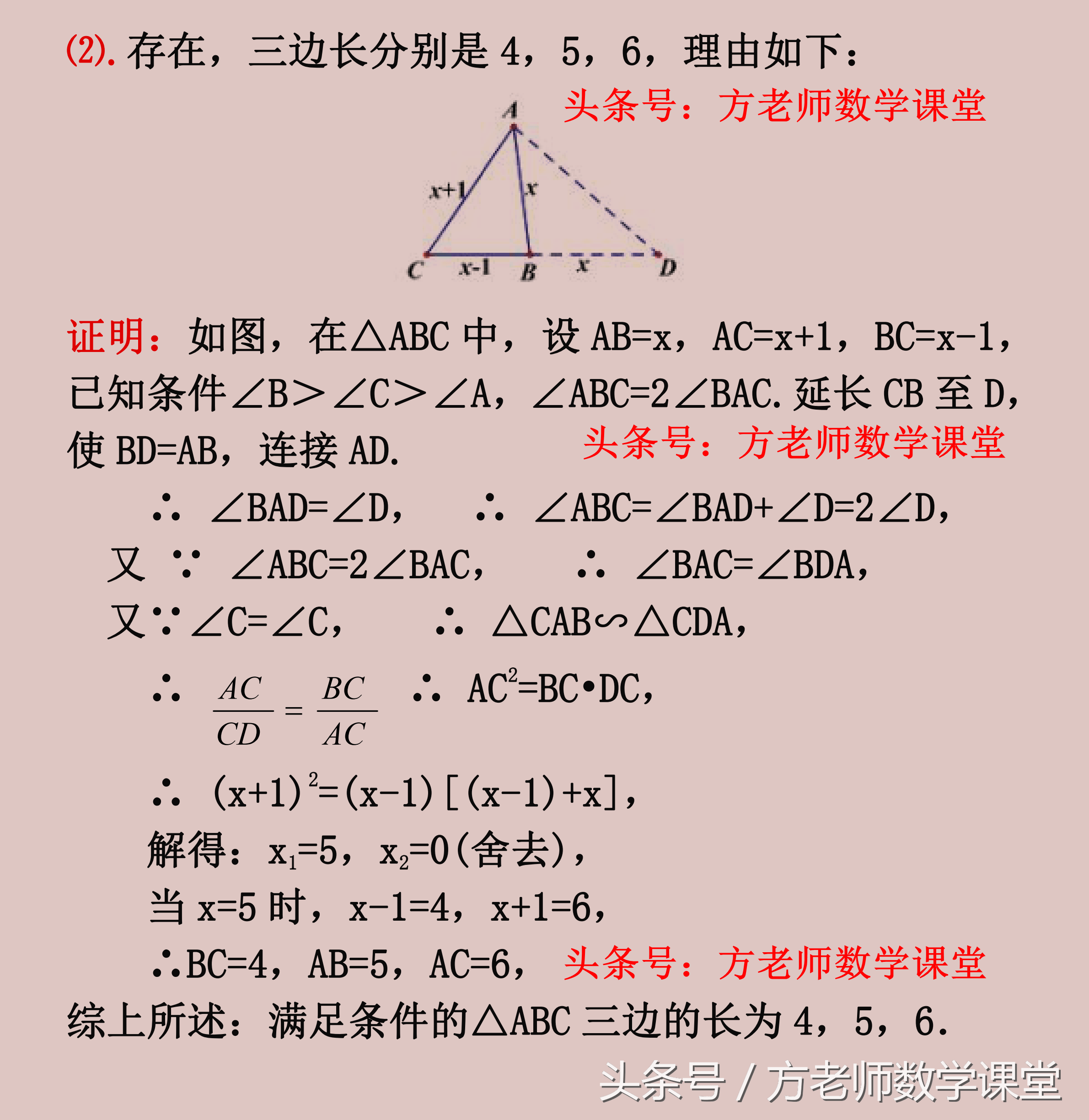 ②.这个图形,其实就是一个非常重要的三角形相似的模型。一个三角形中,一个角是另外一个角的2倍,那么我们如图辅助线,必然会出两个三角形相似。