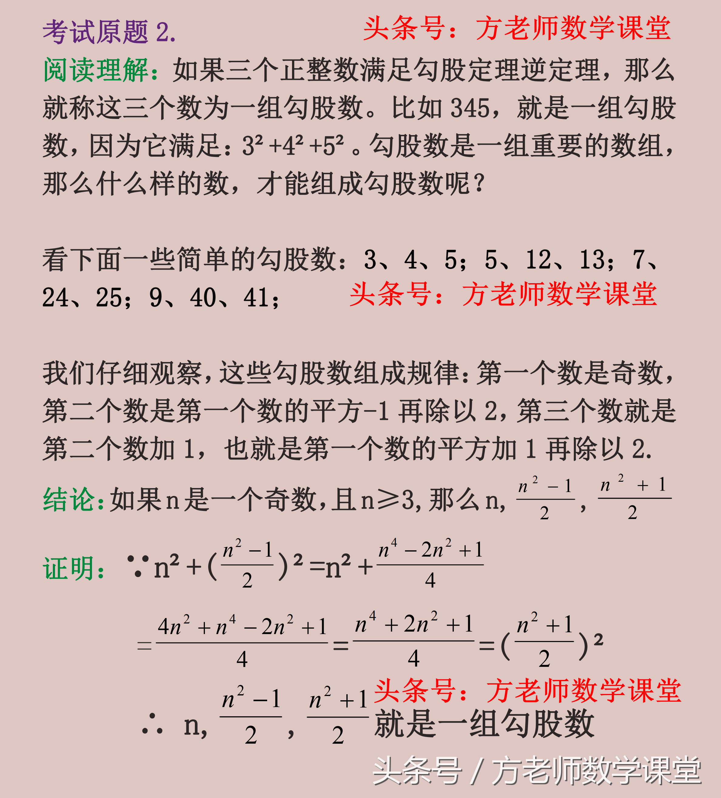 比如第③个结论,其实,我们还可以引申一下。因为,(奇数)²+(奇数)²=(奇数)²,所以就不存在三个奇数会成为勾股数,那么在判定勾股数的时候,若三个数都是奇数,那么就可以首先排除。