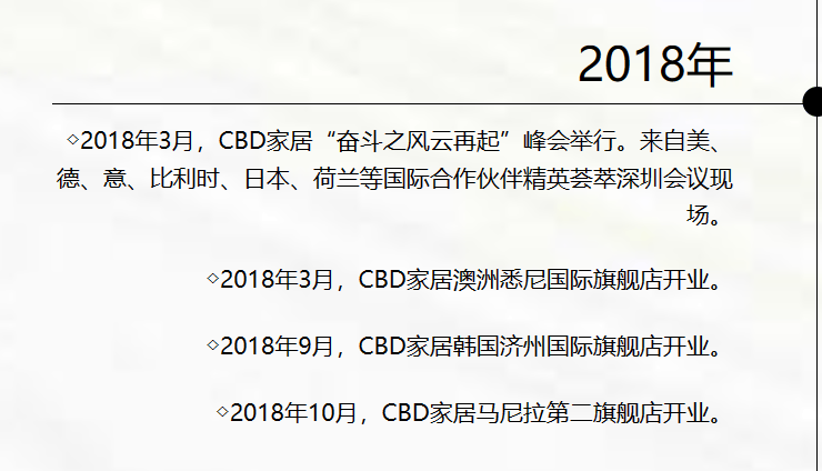 官网把海外开店作为重点宣传,如2017年6月,CBD家居菲律宾马尼拉国际旗舰店开业;2018年3月,CBD家居澳洲悉尼国际旗舰店开业;2018年9月,CBD家居韩国济州国际旗舰店开业;2018年10月,CBD家居马尼拉第二旗舰店开业。