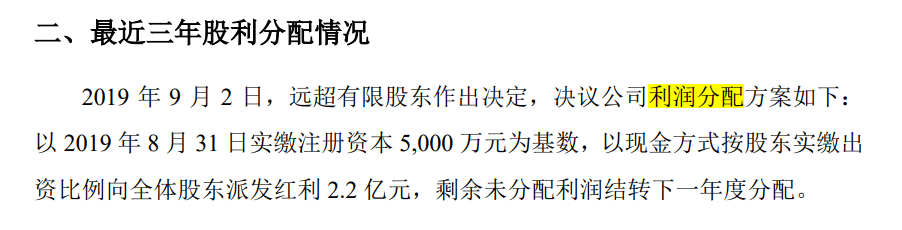 招股书披露,2019年9月,远超智慧一次性分红2.2亿,相当于夫妇二人分走1.7亿。