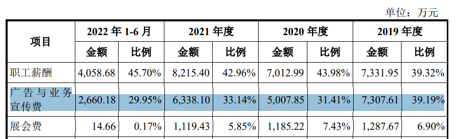 招股书显示:CBD家居的期间费用方面,2021年期间费用为3亿,其中占比最大的销售费用,达到1.9亿,维持在15%左右。招股书显示:公司的销售费用主要由职工薪酬、广告与业务宣传费、展会费等构成。