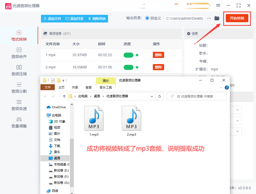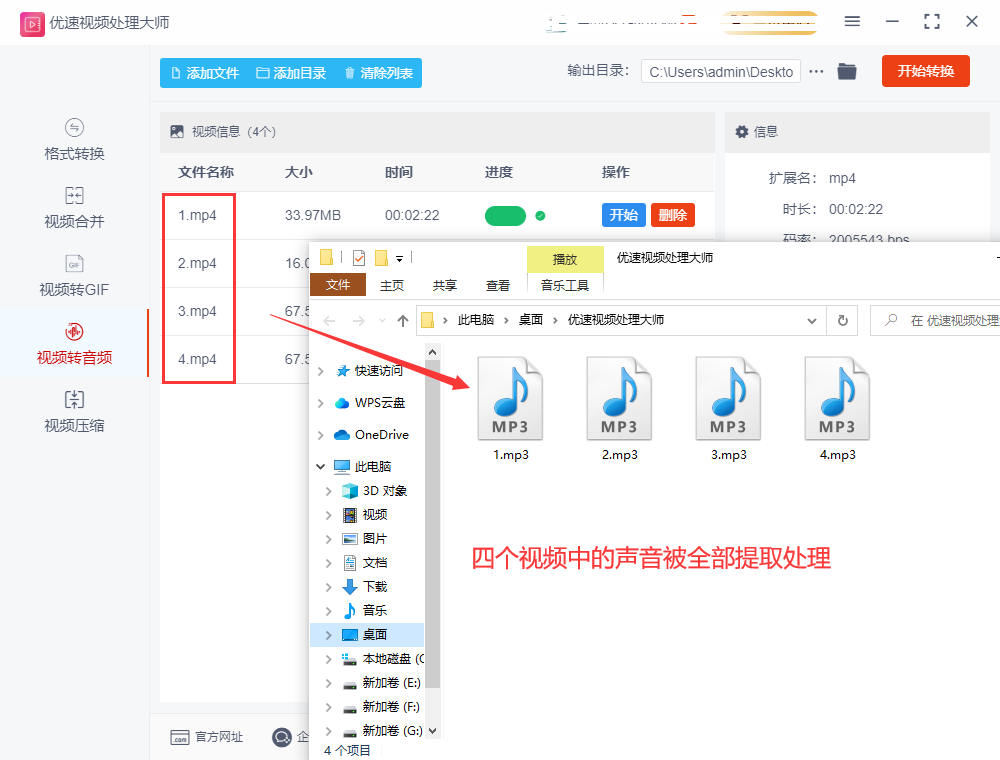 步骤3,最后点击【开始转换】按钮,启动软件,这样就启动转换程序了,转换结束后,软件会自动打开输出文件夹。从结果可以看,软件成功将几个mp4视频转成了mp3音频文件,说明成功的将视频里的声音提取了出来。