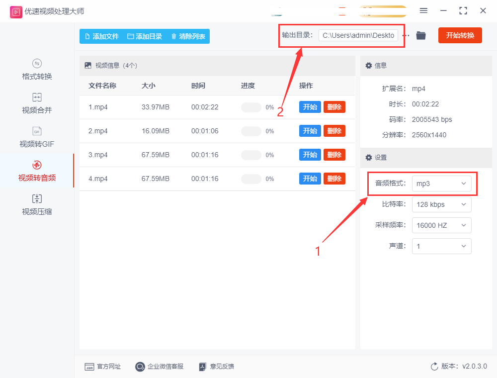 步骤3、在视频文件右侧设置转换后的音频格式,一般都设置成MP3格式,这样的播放兼容性比较高;然后在右上角设置输出目录,提取后的声音就保存在此处。