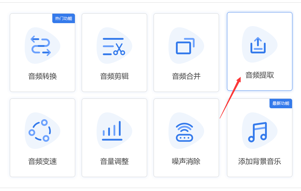 步骤1、在电脑上下载好云朵音频转换器软件后安装好,安装好之后直接打开使用,此时我们可以在软件的主界面看到8大功能,点击其中的音频提取功能进入下一步。