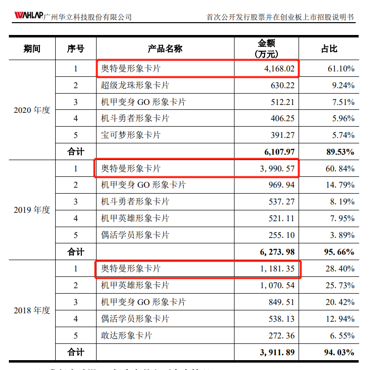 华立科技招股书显示,2018年-2020年,华立科技动漫IP衍生品收入分别为4160.23万元、6558.66万元、6821.90万元;其中,奥特曼形象卡牌收入分别为1181.35万元、3990.57万元、4168.02万元。华立科技表示,目前发行人动漫IP衍生产品的销售主要系销售动漫形象卡片。