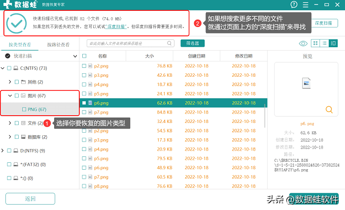 3.扫描结果出来后,选择要恢复的图片类型,并在右侧选择要恢复的照片,如果想搜索更多不同的文件,可点击上方【深度扫描】并等待;