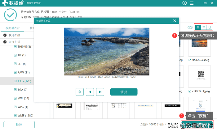 4.深度扫描结果出来后,可通过切换视图来预览图片,选择完要恢复的照片后,点击下方【恢复】并选择要恢复后照片的保存位置即可。