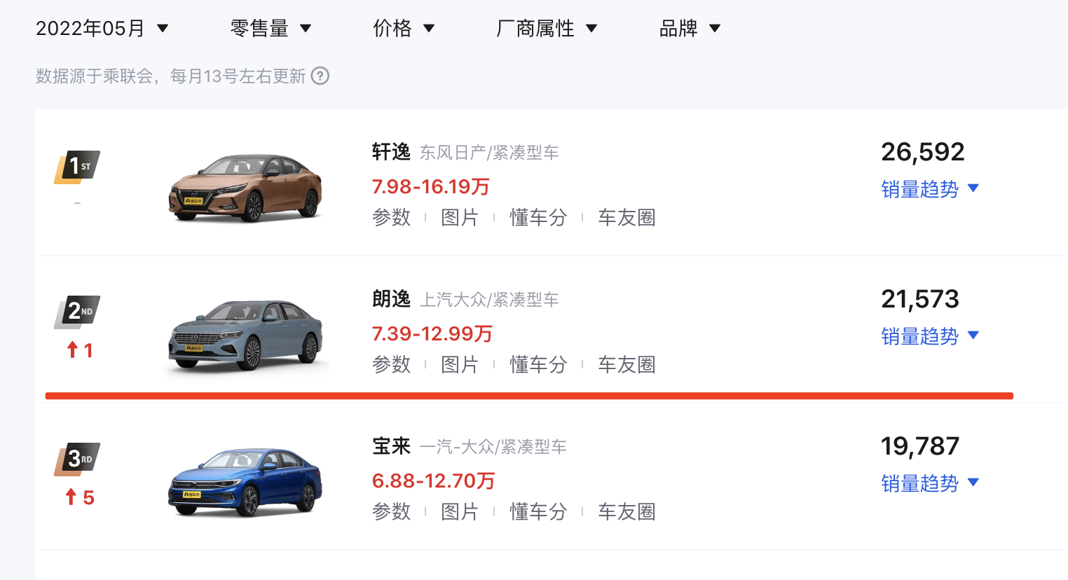 作为合资品牌主流紧凑型三厢轿车之一,朗逸竞争对手主要包括日产轩逸(售价9.98万-17.49万元)、本田思域(售价11.99万-16.99万元)、丰田雷凌(售价11.38万-15.28万元)等车型。结合销量来看,现款朗逸5月销量为21573辆,位列当月紧凑型车销量榜第2位。