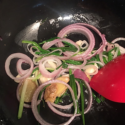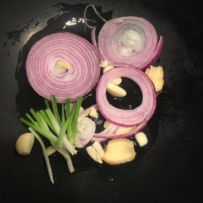 4、冷锅冷油下入除葱叶之外的所有配料小火煸炒。