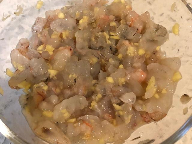 1、虾仁改刀、去虾线,放入姜末及少许料酒,腌20分钟。