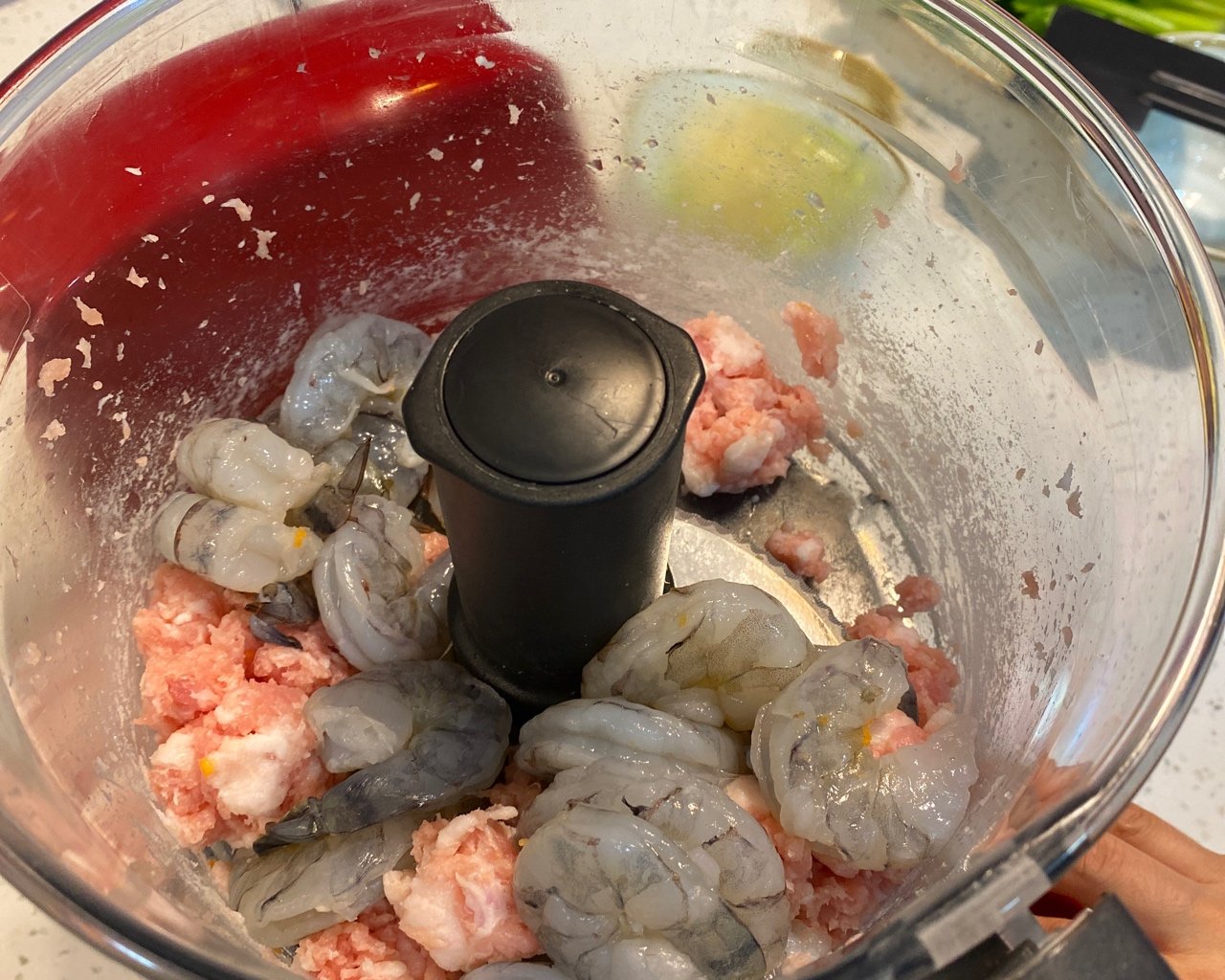1、去掉猪皮的鲜肉180克,打成肉馅,加上虾仁转动2秒钟,同样打成颗粒,混合在一起。