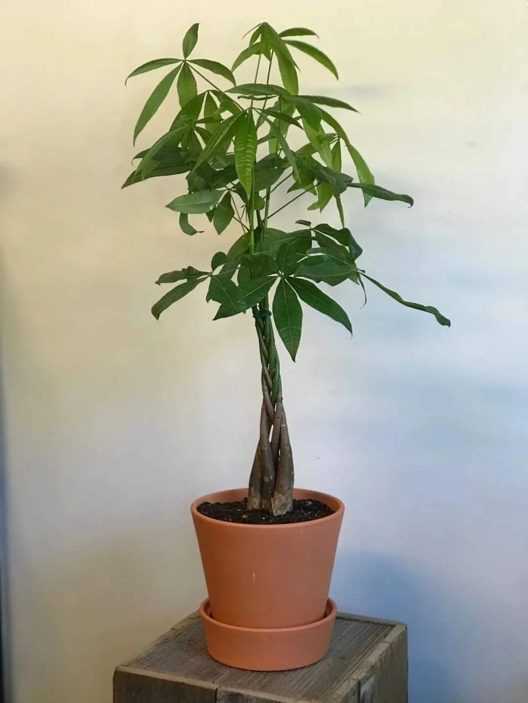 有一种发财树盆栽比较流行,就是一些用3~4个枝条,种在一个花盆里,让它们的枝条互相缠绕向上生长,就形成一个辫子的形态,这种就是辫子状发财树。