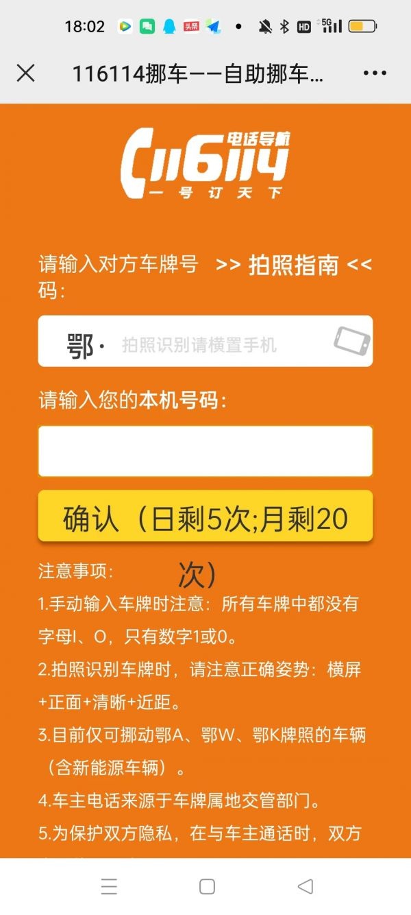 此外,车主也可以通过116114挪车公众号进行挪车服务,在打开的页面中输入对方的车牌号和本人电话后,可以直接跟对方车主通话挪车。