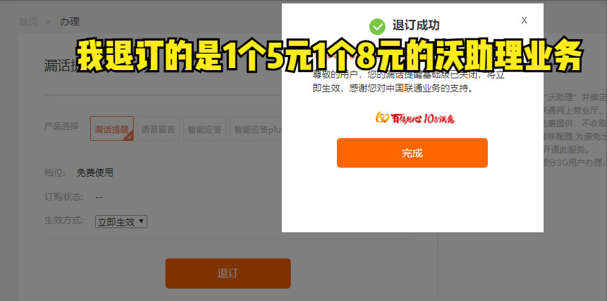 我退订的这个业务 需要先退子选项,就是图片上后面的那些,在退第一个漏话提醒。