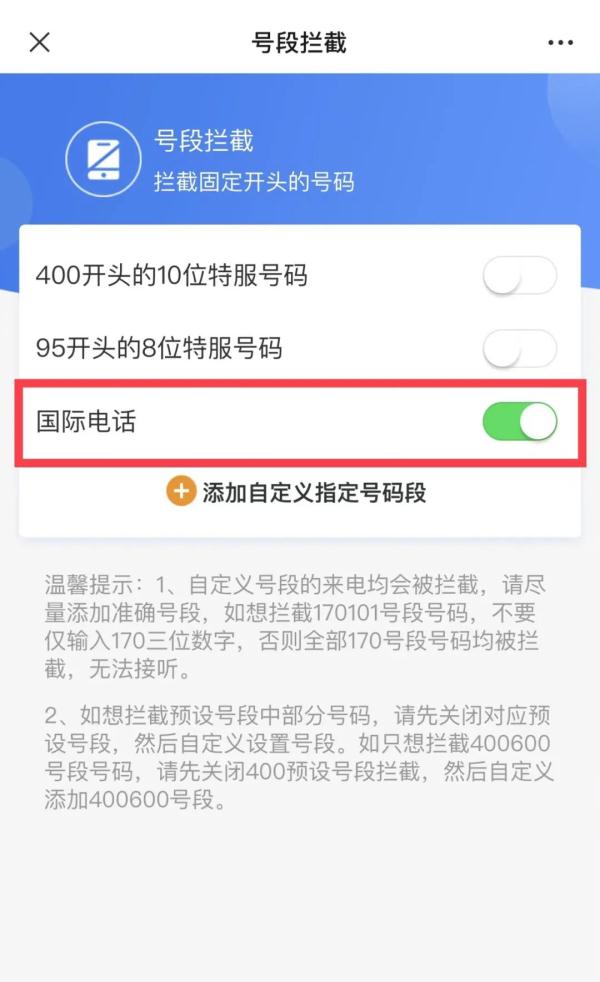 拨打10010,或关注“智慧沃服务”微信公众号:手机管家——号段拦截——国际电话智能拦截设置——开启。