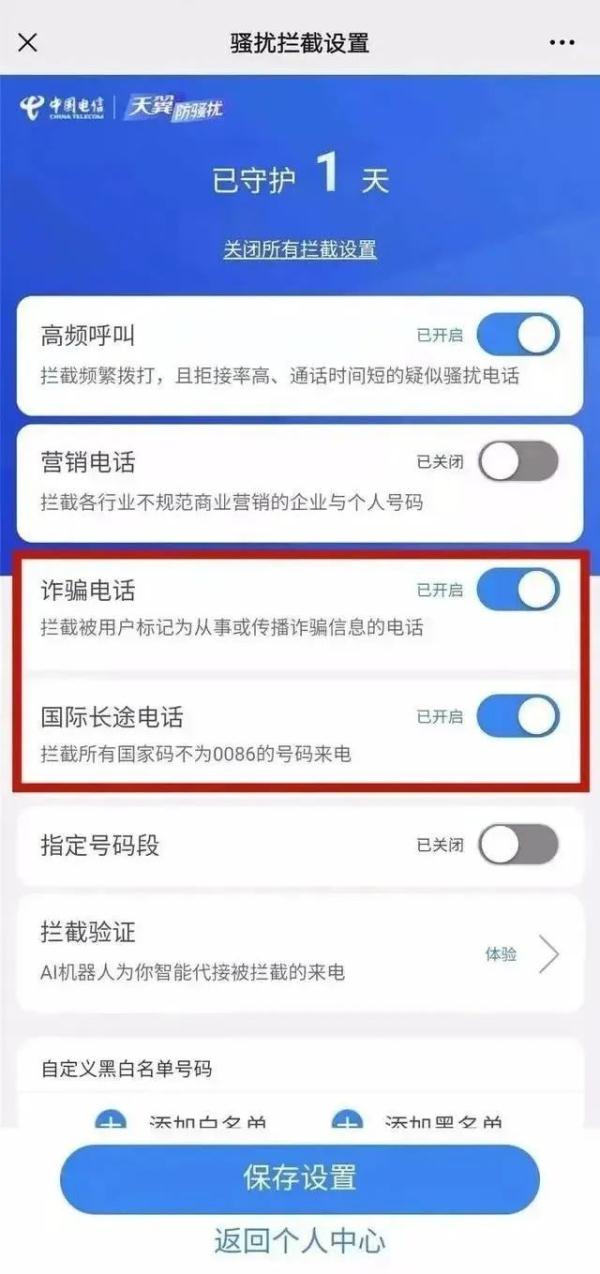 拨打10000,或关注“天翼防骚扰”微信公众号:业务设置——智能拦截设置——国际长途电话——开启。