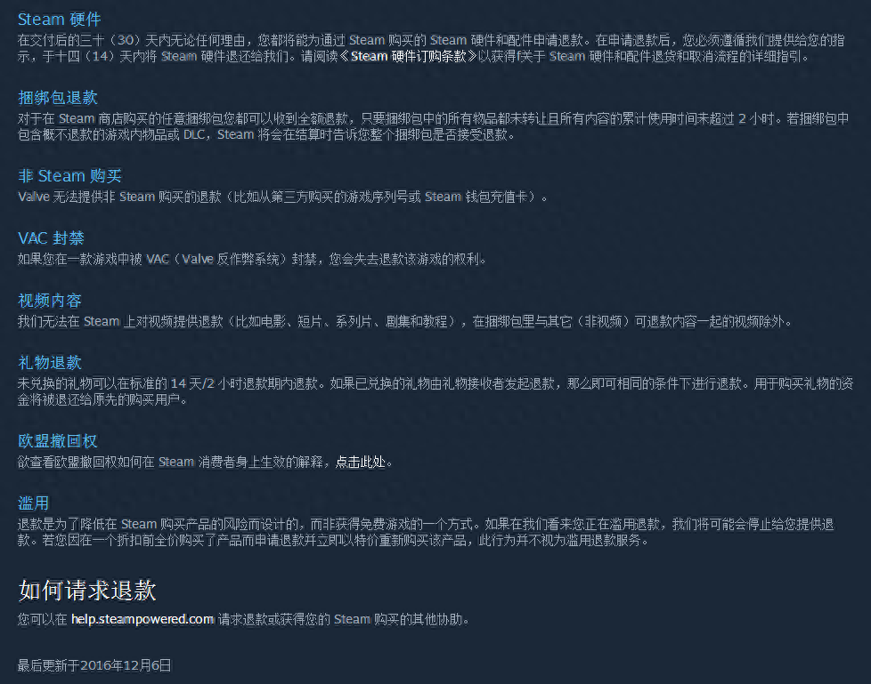 只要是在购买后 14 天之内且游戏时间不超过 2 个小时的情况下提交的,Valve 都将提供无理由退款。详情参见下文,但即使超过了上述的退款时限,您也依然可以提交退款申请,我们将会酌情考虑。