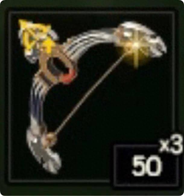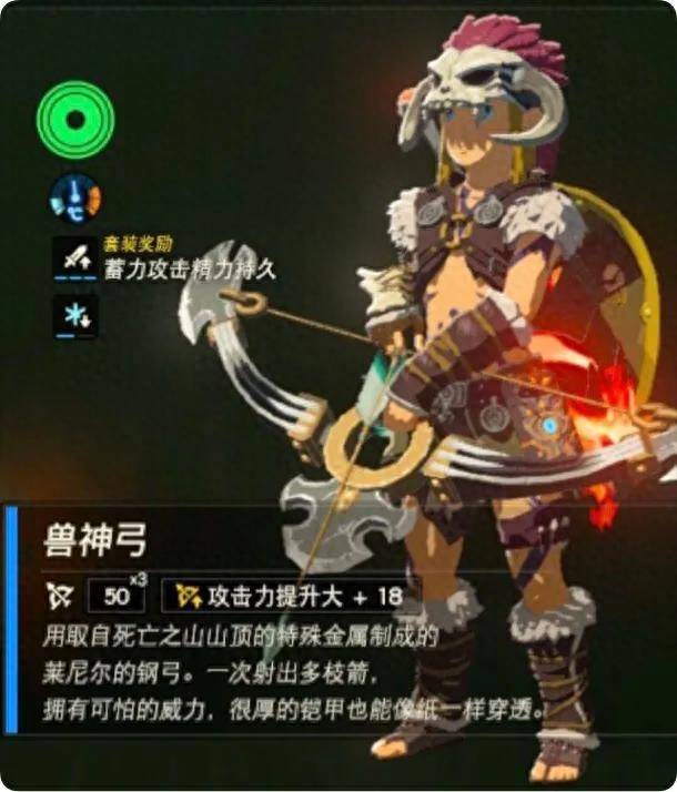 19. 兽神弓(50×3)许多人迷恋的神话,不收藏一把50×3的兽神弓,出门都不好意思跟人打招呼,确实比5连弓难出很多倍,但实用性并不优于5连弓,贴脸射人马还是首选5连,毕竟18发带走黄金人马。出去海拉鲁浪一浪,3连弓射程跟射速又不够看,十分矛盾的存在。可能有价值的收藏品都是不实用的东西吧,实用的古董都卖不出好价钱。