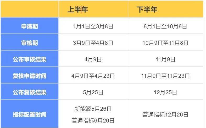新能源一年有一次指标配置,普通指标一年有两次。每年5月26日配置新能源小客车指标,每年6月26日和12月26日配置普通小客车指标。