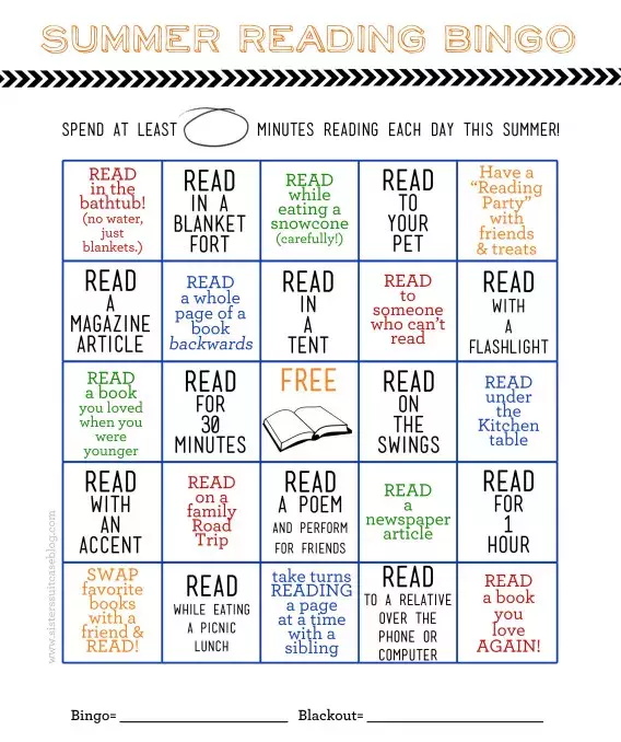 BINGO形式的计划表,把读书变成了玩游戏。表格里面包括read in the bathbub(在浴缸里读书)、read in a blanket fort(盖着毯子读书)、read to your pet(给宠物读书)等内容。