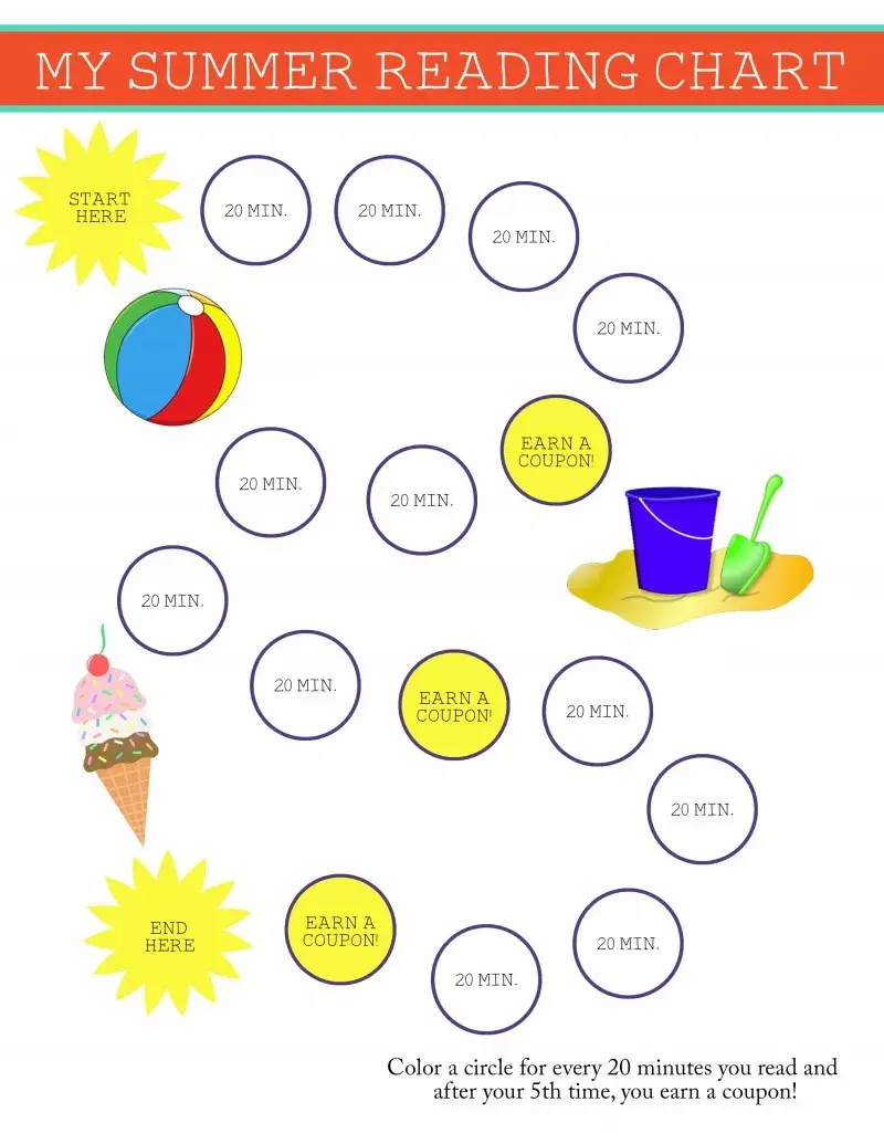 每次阅读满20分钟,可以在阅读图标上涂色,每涂满5个代表20分钟的圆圈后,可以兑换一张阅读奖励券,整张阅读图表都涂色后,可以兑换一张大额奖励券。