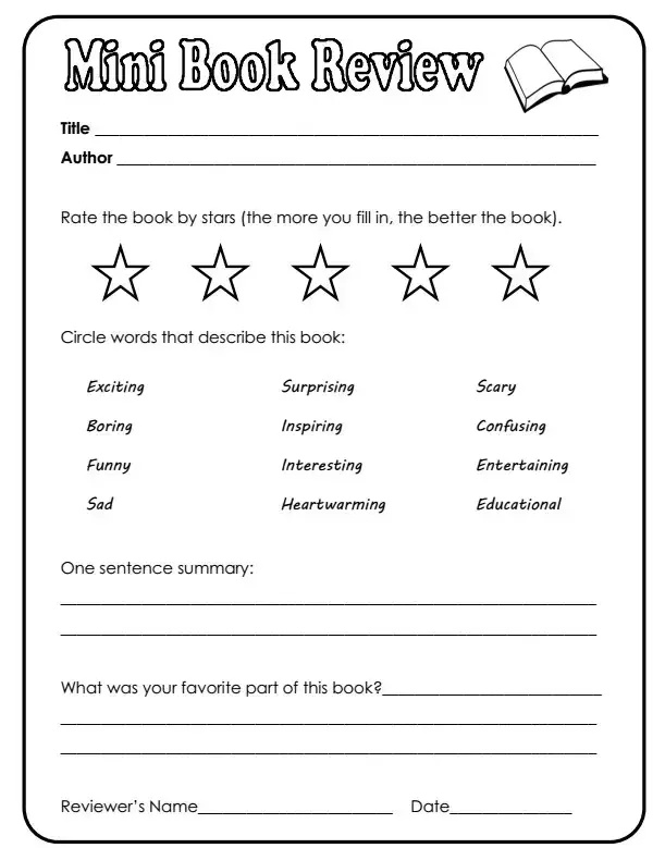 星标读书报告表。除了书名和作者之外,还要用点亮星星(涂色)的方式,给整本书打分,并圈出能代表自己感受的单词,还要写出一段话的归纳总结。