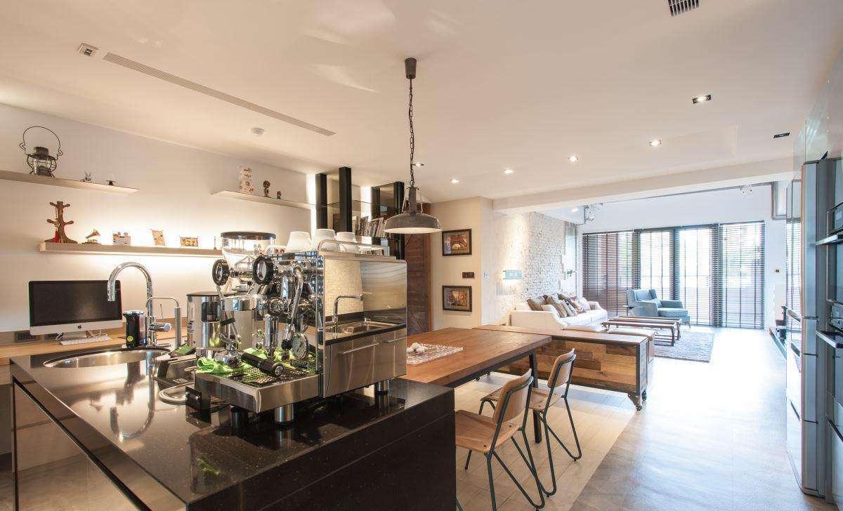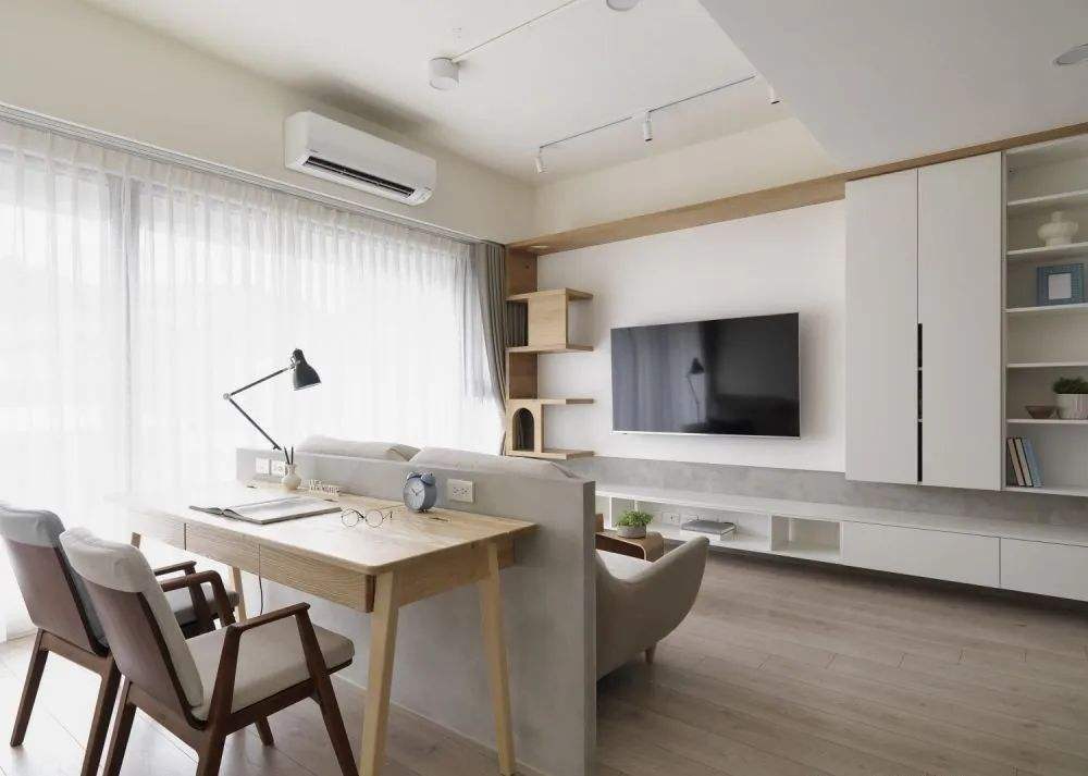 所以沙发能靠墙还是尽量靠墙,如果实在靠不了墙,可以考虑在沙发后面做一堵矮墙,或者做一个吧台。像上面这样,不仅让沙发背后有靠,还能增加客厅的功能(可以在吧台上办公、吃饭等)。