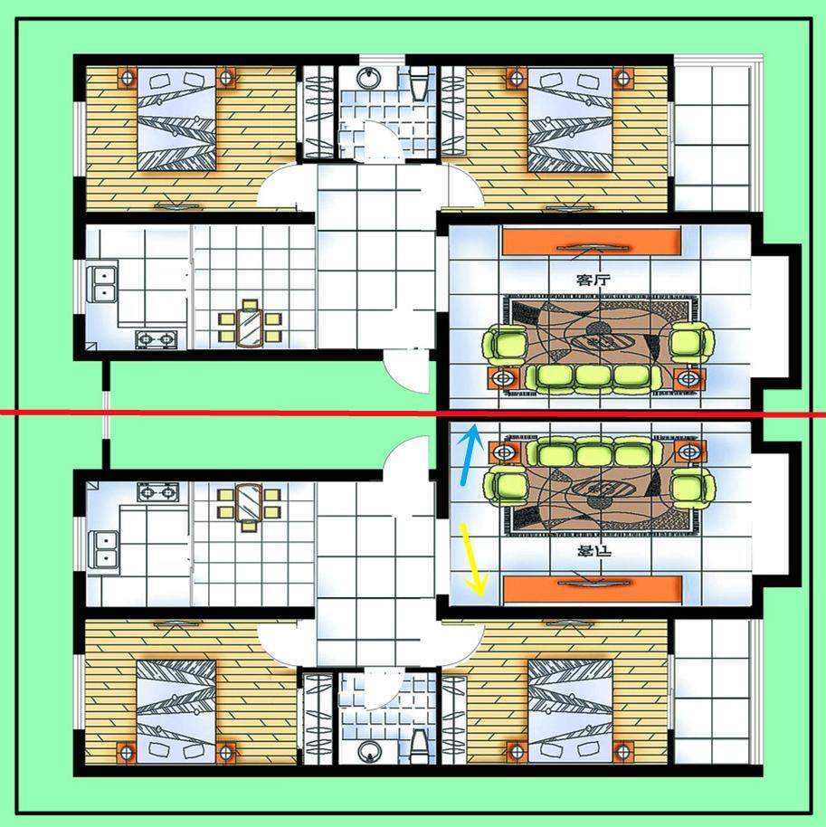 看看下面这个户型图,红线下方是自己家,摆放沙发的墙面有蓝、黄两个箭头可选▼