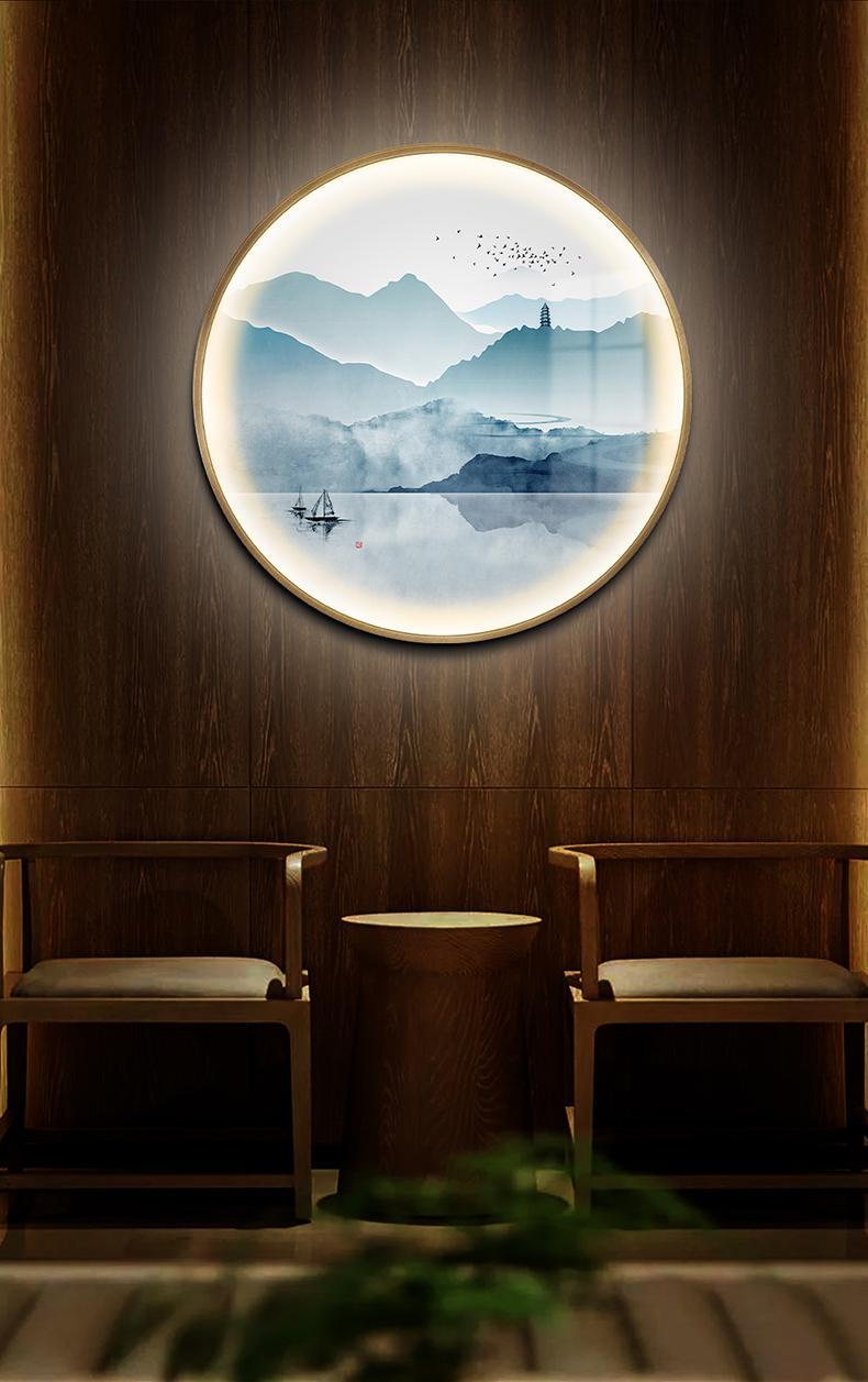 圆形的画框就更好了,没有棱角的线条,视觉感会更加柔和。对装修风格的要求也会更少,无论是不是中式(新中式)装修风格,都不会显得突兀。