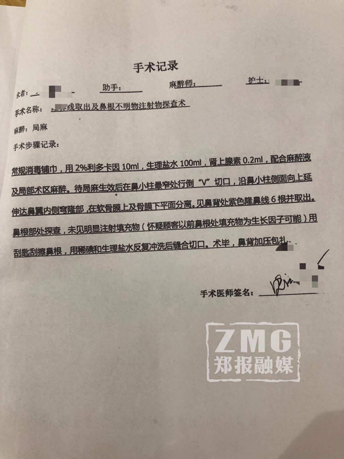 “他们说把里面的液体抽出来就行了。抽的时候却抽不出来,他们告诉我:怀疑我之前打过不明物体,需要把不明物体取出。要在鼻根部割开,做手术刮出来。以后给我装假体就更漂亮了。”
