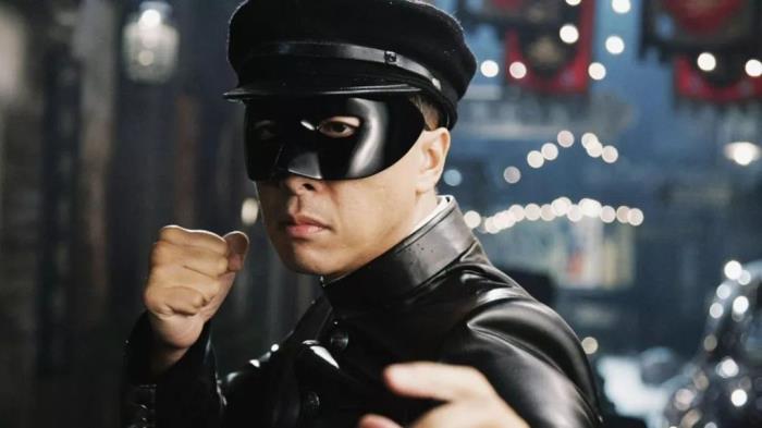 余文乐饰演的爱国将领曾将军被日本人刺杀,陈真在街边的橱窗里抢了一身中山装款式的皮衣皮帽加皮眼罩,化身夜行侠出手相救。这些造型像极了李小龙当年在美国出演过的一部电影《青峰侠》,还有后来李连杰的《黑侠》,而在这时是一部上映中的电影的造型,电影名叫《天山黑侠》,不久天山黑侠风靡整个上海滩。日本人内部下发了一个暗杀名单,陈真收到消息,要把名字上的人一一解救,曾将军就是一个。日本人已经怀疑陈真在夜总会的身份,向他施加压力,黄秋生饰演的上海滩大亨出面,带了记者曝光了此事,于是日本人私下和陈真打赌,“看你救得多,还是我杀得多?”。陈真无法拒绝,于是每天都有天山黑侠救人杀人的消息上报,上海滩开始满街都是戴黑眼罩的小孩。甄子丹这身黑侠是真皮的,防水那种,在晚上雨战的时候水珠滴在衣服上的效果特别漂亮;这已经不是传统的中国民间侠客,已经变成美国式的超级英雄。所以,本片还有个名字叫《夜行侠陈真》。【像蜘蛛侠那样,有自己的制服,暗中行侠仗义,白天还是个普通人;只是人家的制服是自己设计定制的,陈真的是街抢的,怎么就能这么合身呢】