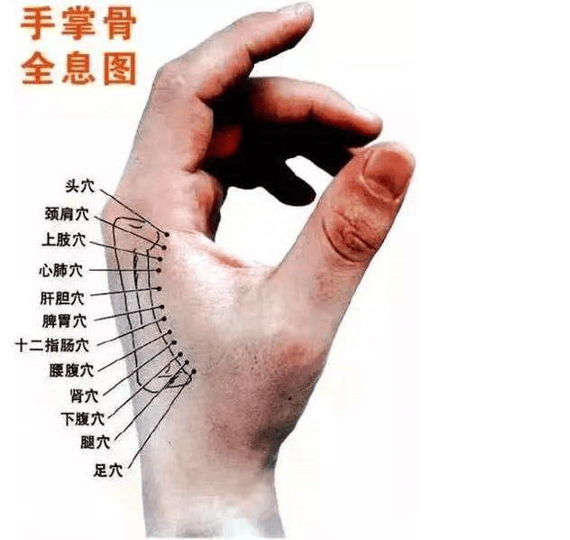 首先找到手部与食指相连的第二掌骨,将拇指内扣掌心,其余四指内收握住拇指,虎口朝上。全身各脏腑器官依照从头到足的次序排布在第二掌骨上。充分暴露出第二掌骨后,寻找中部的胃区(如图),胃痛正在发作时,此穴区会有明显的针刺样疼痛感。用刮痧板垂直按压第二掌骨中部的胃穴,压住皮肤,做微小移动,仔细寻找疼痛敏感点,重点按揉疼痛敏感点2—3分钟。待胃区刮痧的疼痛稍有减轻,胃痛也会慢慢缓解。