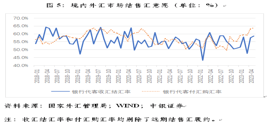 从数据上来看,企业主体“逢高结汇”的意愿仍较强。数据显示,4、5月份企业结售汇均保持顺差,4月份,剔除远期履约的收汇结汇率环比上升9.9个百分点,同期付汇购汇率增幅仅为3.8个百分点;5月份,收汇结汇率环比上升1.1个百分点,仍然高于同期付汇购汇率0.6个百分点的增幅。