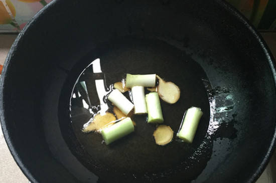 在锅中倒入适量的油,加入大蒜、葱段、生姜片炒出香味后,下入火锅底料、干辣椒、花椒。