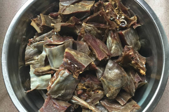 将干野兔剁成小块,用温水浸泡12小时以上,吸收水分。