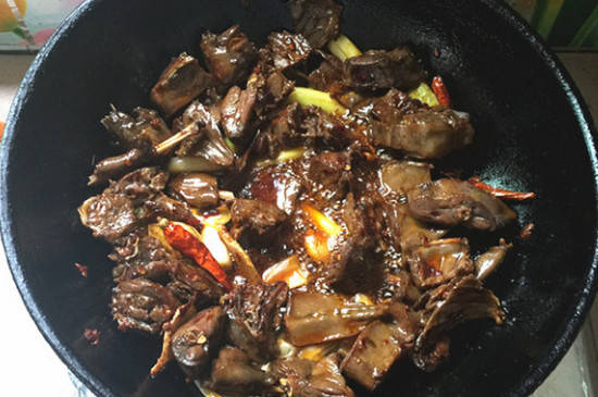 小火炒出红油后,下入焯好水的干野兔,炒至野兔沾满酱料,加入没过食材的开水,煮至半小时左右。