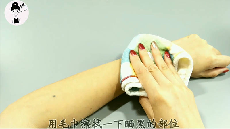 步骤三:找一个干净的小毛巾,放进去,把小毛巾浸湿,用毛巾擦拭晒黑的部位。