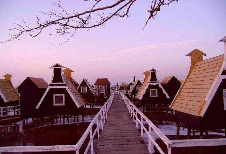 月坨岛的建筑是仿荷兰风情而设计的,一座座红顶小木屋,又叫情侣屋,悬空于海滩,与爱侣置身其中,谛听大海的潮涨潮落,别有情趣。