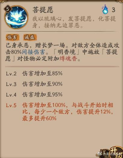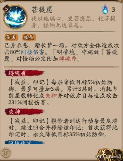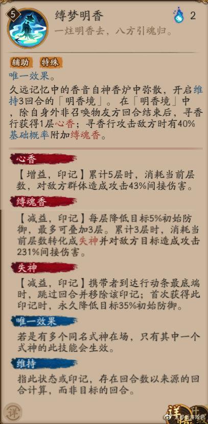 二技能【缚梦明香】属于幻境类,满级后自带[先机]效果,是该式神的核心技能。