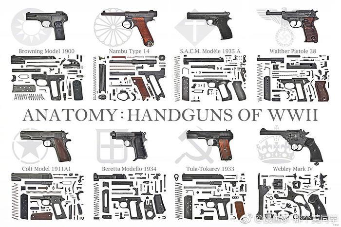 国外某知名轻武器网站将二战中各国著名手枪逐一进行完全拆解,并通过现代技术拍照,欣赏到平时难得一见的手枪内部零件