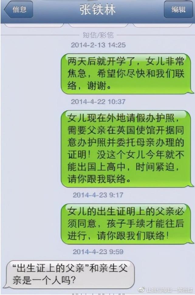 有次张铁林给楠楠发短信,希望她能将自己出生证明上,亲生父亲那一栏的名字给抹掉。