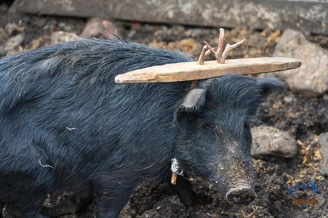 在加拉村我还碰到一件趣事:这个村藏香猪非常多,但唯独这位造型独特,像古代戴着刑具的犯人。我非常好奇,于是拍了照片找当地人询问缘由,才知道原来它跑到田里糟蹋了庄稼,被主人夹住了脖子,不给进食了。