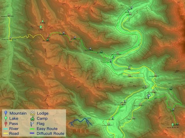 请参照下图了解整个南迦巴瓦的徒步路线和山峰分布情况,需要说明的是本地图所标注的徒步路线和观景地点只能表示该地理位置是可以到达的,但可能并不十分精确,仅供参考。户外有风险,请选择优秀团队安全出行。