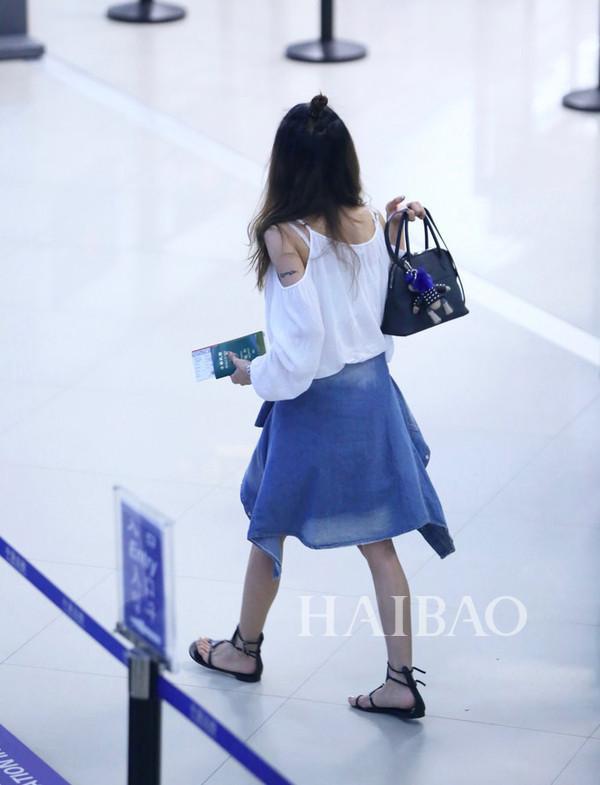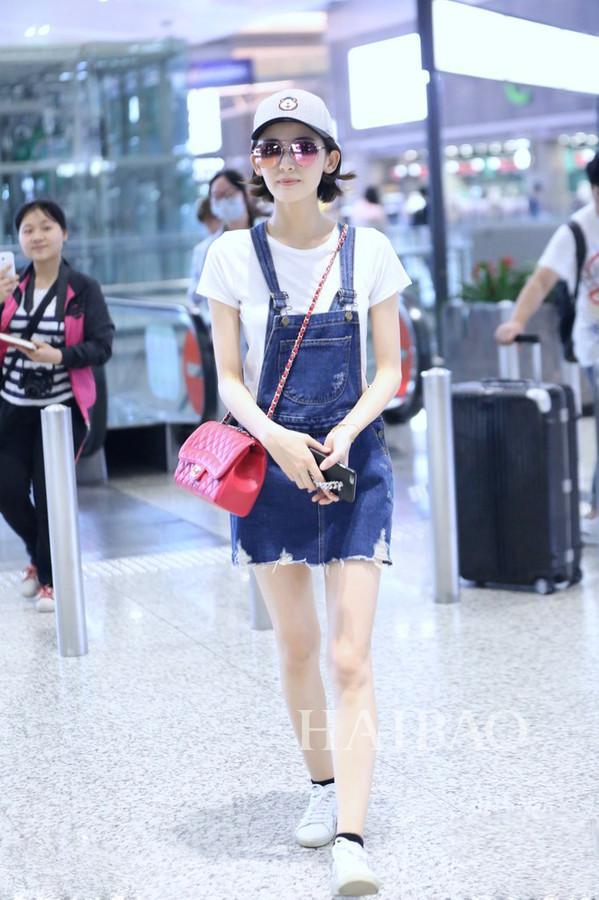 讲真,神仙姐姐的这身穿搭真的很失仙范儿,虽说是夏日经典上白下黑的一个穿搭,但溜肩穿这样过于柔软的棉布类的Tee还算一个蛮大的挑战,就算是持颜行凶的刘亦菲也没有很好的Hold住。