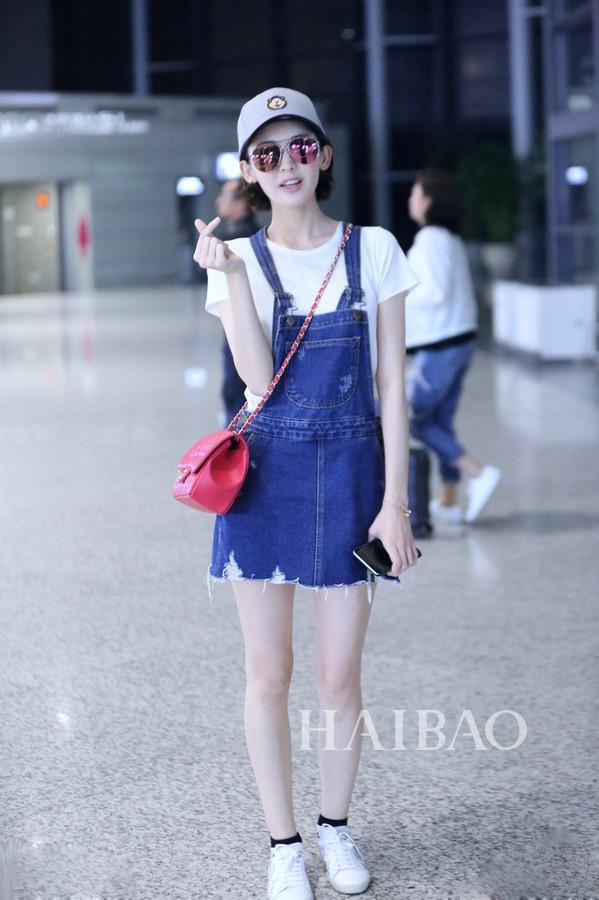 毛边牛仔裙搭配白Tee,娜扎这身青春味正浓,背香奈儿 (Chanel) 红色链条包又让这青春的荷尔蒙带上一点成熟的味道。